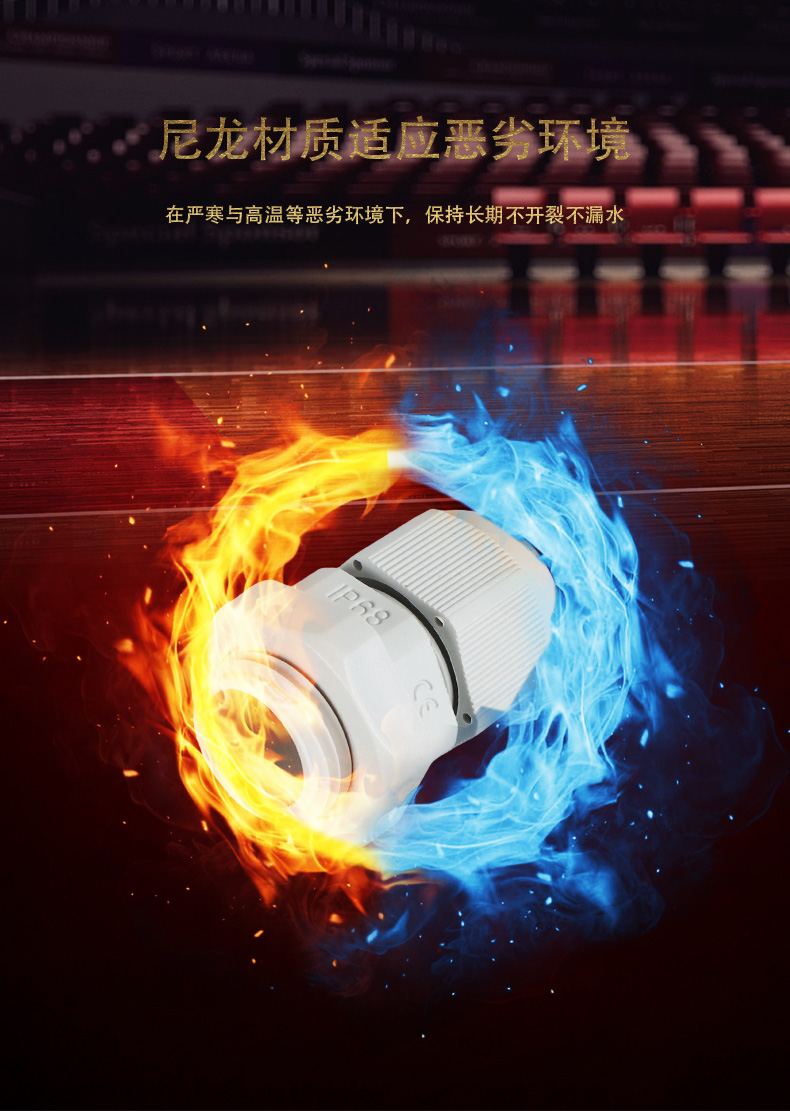 尼龍材質(zhì)適用惡劣環(huán)境紅、灰、黑、深灰、白、藍(lán) 六種顏色常規(guī):黑、灰兩種顏色,其它顏色需要定做在嚴(yán)寒與高溫等惡劣環(huán)境下,保持長期不開裂不漏水高密封性防水接頭保護(hù)電纜安全,長期使用不容易滲水