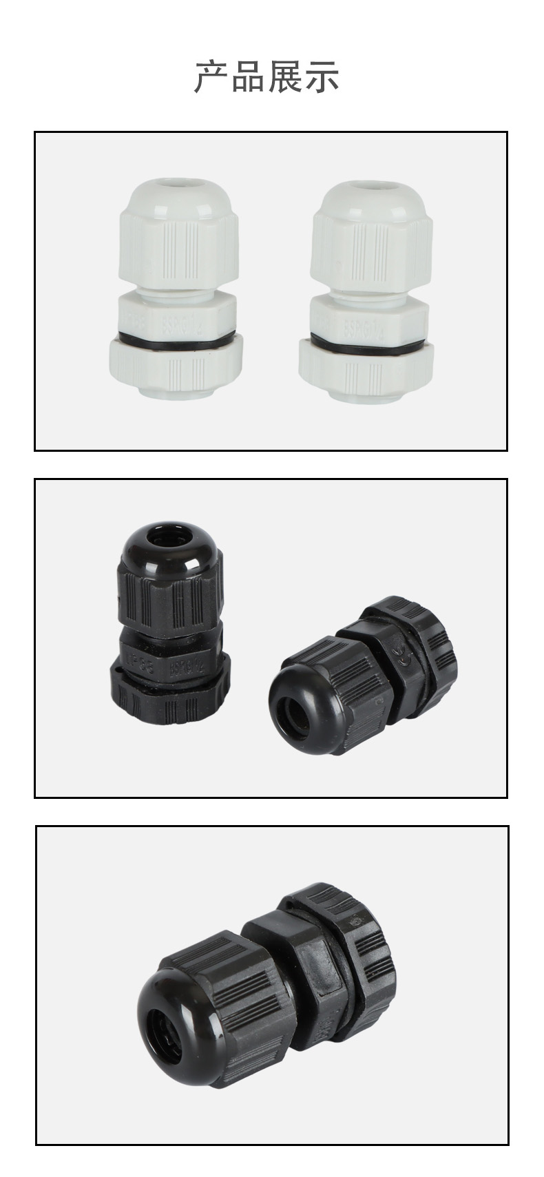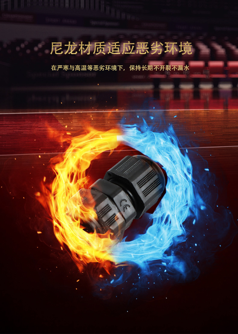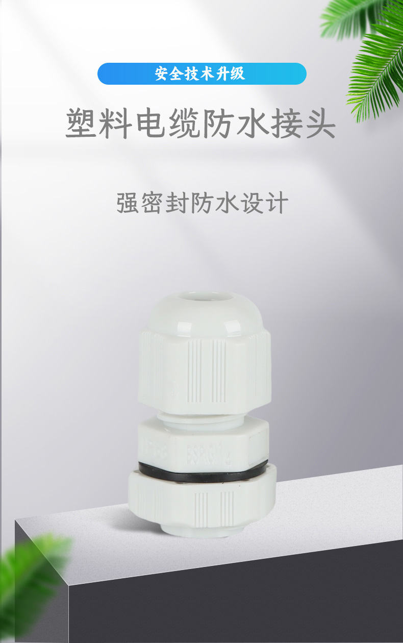尼龍材質(zhì)適用惡劣環(huán)境紅、灰、黑、深灰、白、藍(lán) 六種顏色常規(guī):黑、灰兩種顏色,其它顏色需要定做在嚴(yán)寒與高溫等惡劣環(huán)境下,保持長期不開裂不漏水高密封性防水接頭保護(hù)電纜安全,長期使用不容易滲水